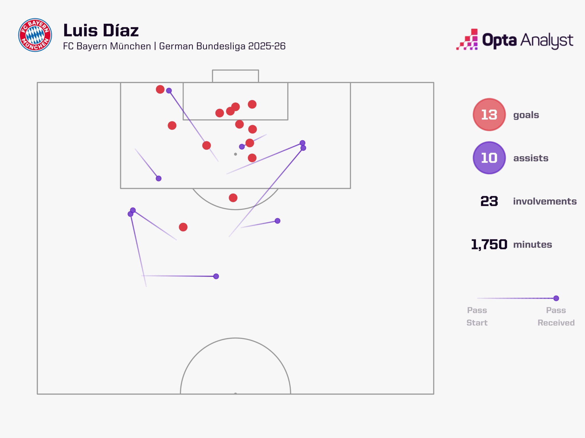 در مورد دیاس با 23 مشارکت گل در بوندسلیگا، باید گفت او از بهترین آمار خود با پیراهن لیورپول در لیگ برتر (18 مشارکت در فصل 25-2024) عبور کرده است. او همچنین این فصل ۴ بار در یک بازی بوندسلیگا روی ۳ گل اثر مستقیم داشته و این، دومین آمار برتر رقابتها پس از هری کین (5) بوده.