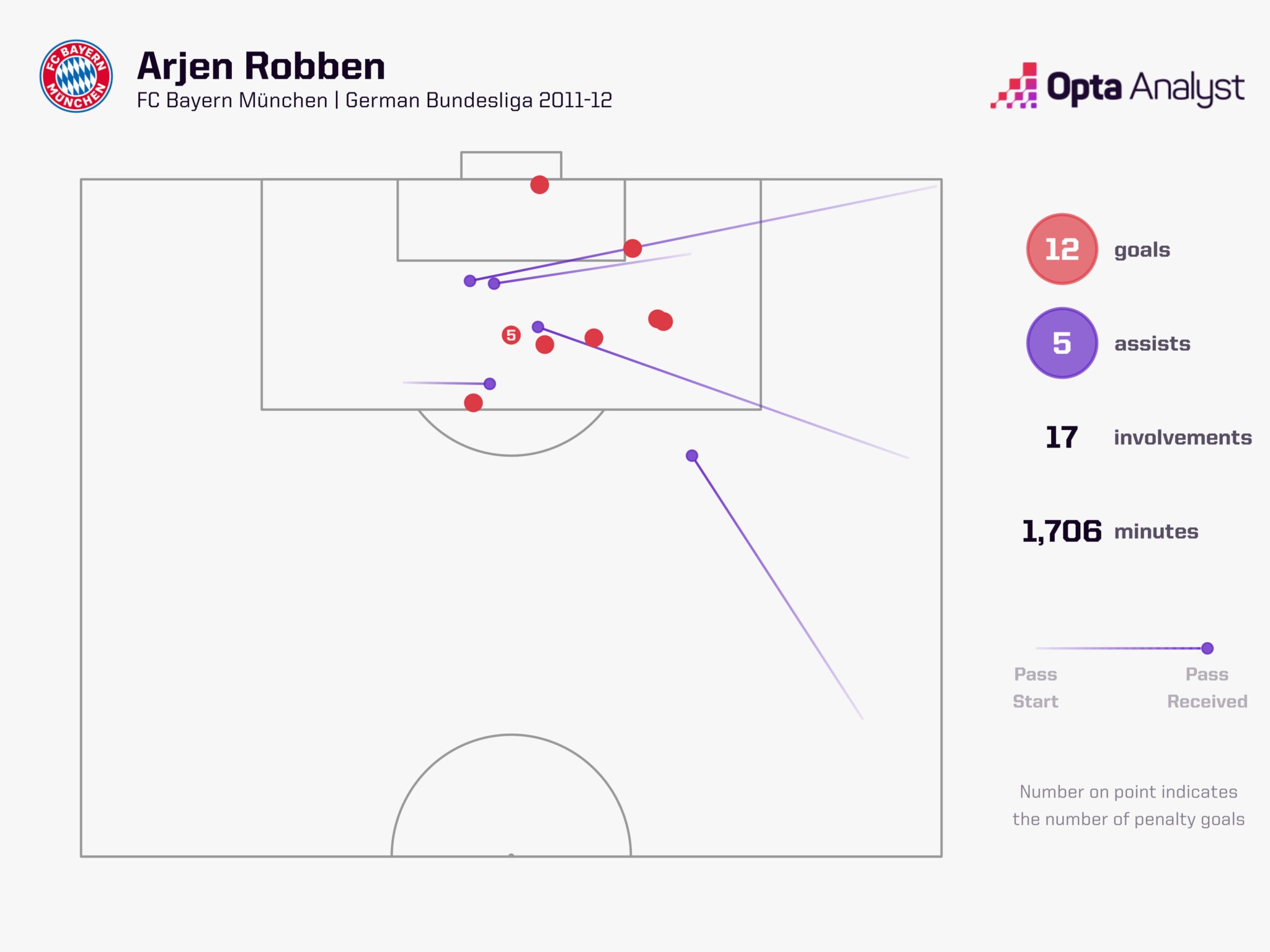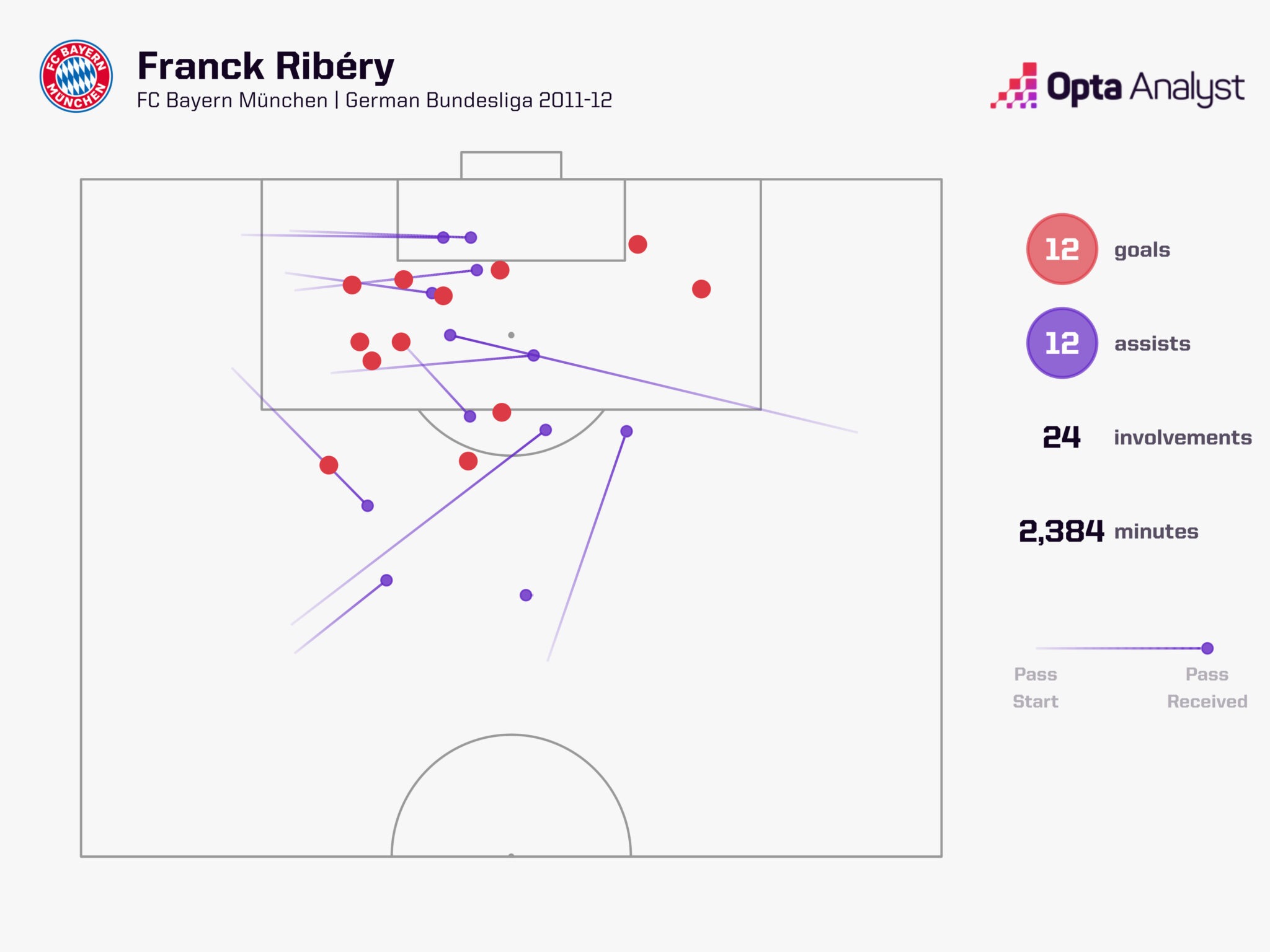ریبری فقط در ۲ فصل از 12 فصل خود، میانگین لمس توپ بیشتری در محوطه جریمه حریف نسبت به اولیسه (8.7) و دیاس (8.9) در این فصل داشت. روبن در یک فصل چنین آماری ثبت کرد. ریبری همچنین هرگز به آمار میانگین شوت در هر 90 دقیقه اولیسه (3.7) و دیاس (3.3) در فصل جاری نرسید.